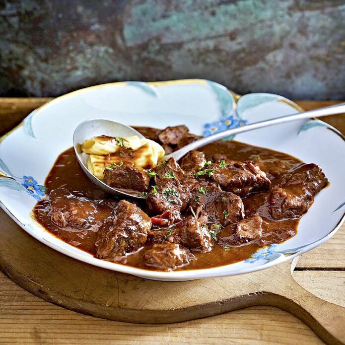 In einer hohen Pfanne das Butterschmalz erhitzen, Paprika rösten und entnehmen. Das Fleisch kurz scharf anbraten. Anschließend die Zwiebelwürfel bei schwacher Hitze 5–10 Min. schmoren. Gelegentlich umrühren. Das Tomatenmark mit schmoren.