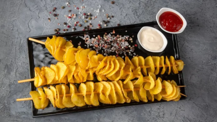 Wasche die Kartoffeln und schäle sie nach Belieben. Stecke die Kartoffeln dann auf einen Holzspieß und drehe sie durch einen Spiralschneider. Ziehe die Kartoffelspirale eventuell vorsichtig etwas auseinander.