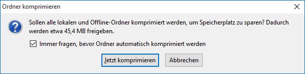 Besser wäre, Sie würden die Einstellung so lassen, aber auf eine Aufforderung verzichten. Wenn die Meldung mit dem Komprimieren beim nächsten Mal erscheint, entfernen Sie darin das Häkchen vor Immer fragen, bevor Ordner automatisch komprimiert werden, bevor Sie auf Jetzt komprimieren klicken. Damit sollte die Komprimierung unter der Haube weiterhin erfolgen, aber ohne Sie mit der Dialogbox zu behelligen.