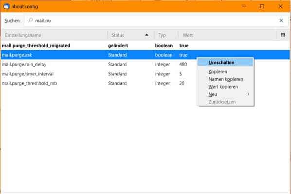Tippen Sie oben im Suchfeld den Filterbegriff mail.pu ein, damit unter anderem der Eintrag mail.purge.ask stehenbleibt. Der Standardwert «true» sorgt dafür, dass Thunderbird Sie vor dem Komprimieren jedes Mal fragt. Wenn Sie das nicht wollen, kippt ein Doppelklick darauf oder der Rechtsklick, gefolgt von Umschalten, den Eintrag auf «false», damit die Frage künftig ausbleibt. Sie können den Eintrag auch wieder auf «true» umschalten, damit die Frage wieder erscheint.
