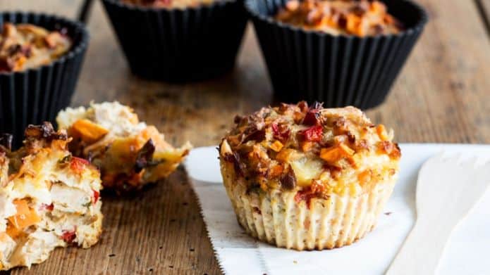 Alle Zutaten in eine Rührschüssel geben und mit einem Mixer gründlich verrühren. Mit den Gewürzen abschmecken. Die Masse auf die Muffin-Form verteilen und ca. 30 Minuten im Ofen backen.