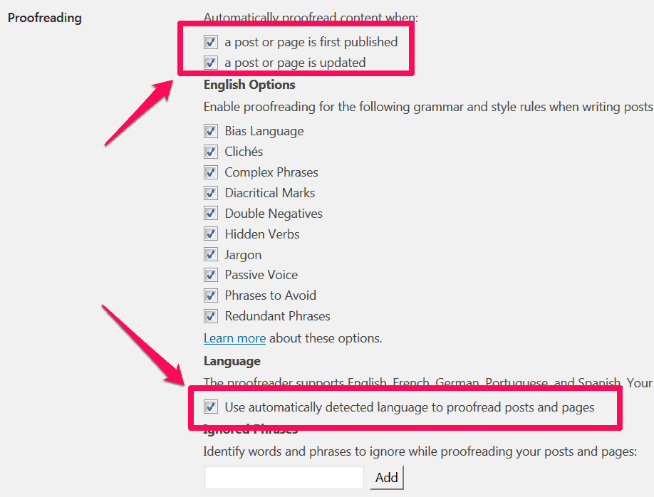 Dort setzen Sie oben die beiden ersten Haken und unten den letzten Haken bei “automatic language detection”. Die mittleren Häkchen in der Konfiguration beziehen sich nur auf die englische Sprache.
