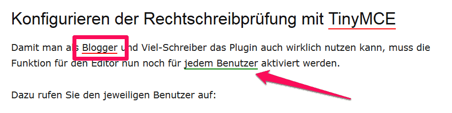 Nach dem Klick auf das Icon von TinyMCE Spellcheck wird dann der Text auf die Rechtschreibung, Vertipper und grammatikalische Korrektheit hin geprüft.