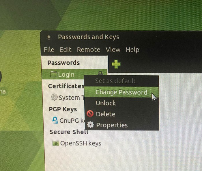 - Unter dem Hautpunkt Passwords den Ordner Login rechtsklicken >>> Change Password