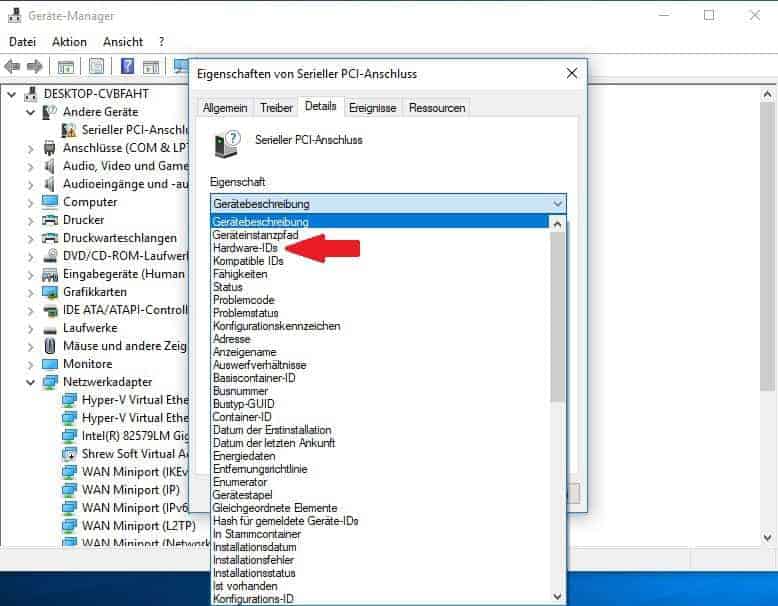4. Gehen Sie auf den Reiter “Details“ und wählen unter “Eigenschaft“, “Hardware-IDs“ aus