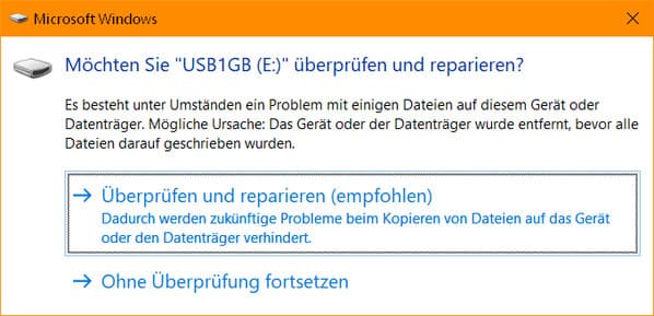 Wenn man den Stick zu früh entfernt, entstehen teils fehlerhafte Dateien auf dem Stick und beim nächsten Einstöpseln bekommt man manchmal solche Meldungen zu Gesicht.