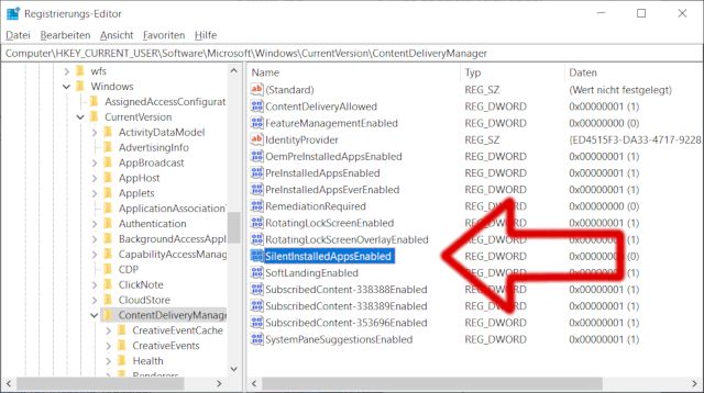 Dort findet Ihr den Schlüssel „SilentInstalledAppsEnabled„, der normalerweise den Wert „1“ hat. Setzt ihn auf „0“ und Windows 10 installiert keine Apps heimlich mehr im Hintergrund.