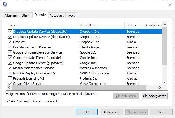 Mit „msconfig“ oder auch „System Configuration App“ genannt könnt Ihr diese Dienste leicht ein- und ausschalten. Hier in diesem Beispiel sieht man Dienste wie 3x „Dropbox-Update“, FileZilla Server FTP, 3x Google Chrome Update-Dienste, Mozilla Maintenance Service, Nvidia Display, Steam Client Service u.a.