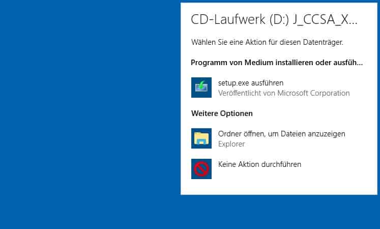 Sobald ihr einen USB-Stick ansteckt oder eine CD einlegt, blendet Windows 10 standardmäßig den kleinen Hinweis ein: Wählen Sie eine Aktion für diesen Datenträger aus. Wenn ihr diesen anklickt, öffnet sich ein Fenster mit verschiedenen Auswahloptionen.