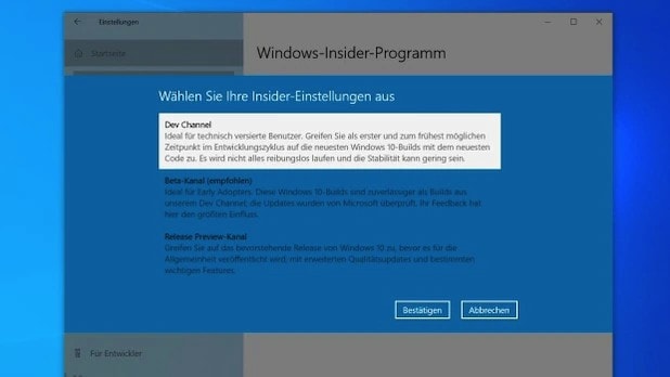 Freigeschaltet werden die Insider-Updates in den Einstellungen von Windows 10 unter „Update und Sicherheit“. Links in der Seitenleiste finden Sie dafür den Menüpunkt „Windows-Insider-Programm“. Beachten Sie, als Insider müssen Sie in vollem Umfang Telemetriedaten an Microsoft liefern. Hinterlegen Sie Ihr Microsoft-Konto bei den Insider-Einstellungen und wählen Sie den passenden Channel. Für den Blick auf Windows 11 wählen Sie den „Dev Channel“. Nach einem Neustart sollten sich in Windows Update die neuesten Entwickler-Builds zeigen.