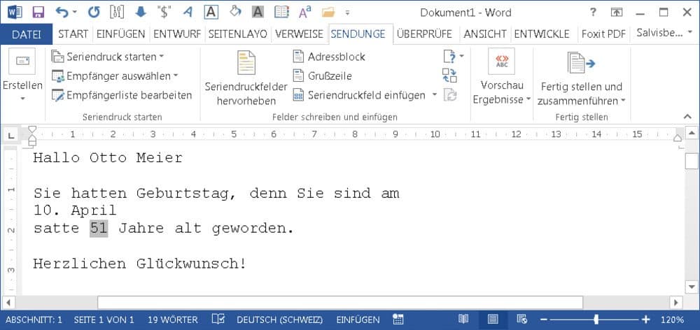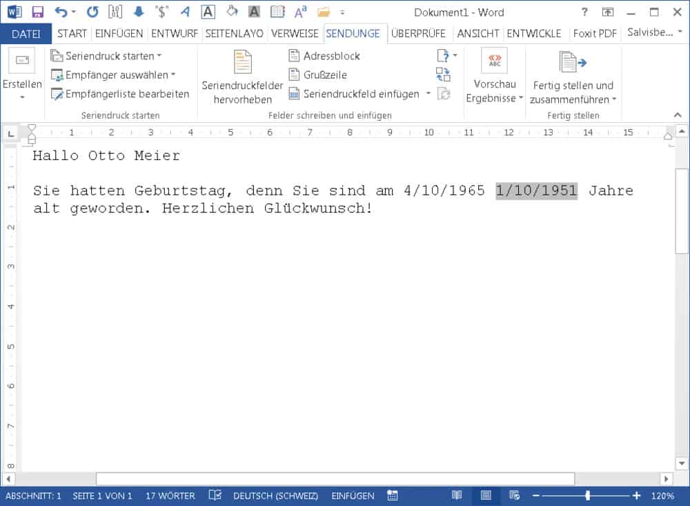 Klicken Sie erneut mit der rechten Maustaste drauf, um die Feldfunktionen wieder auszublenden. Wenn Sie die Daten jetzt zusammenführen oder die Seriendruckvorschau benutzen, werden Sie sehen, dass Word wie gewünscht das Datum in der Form «10. April» bzw. für die Altersangabe schlicht die Zahl «51» ausgibt.