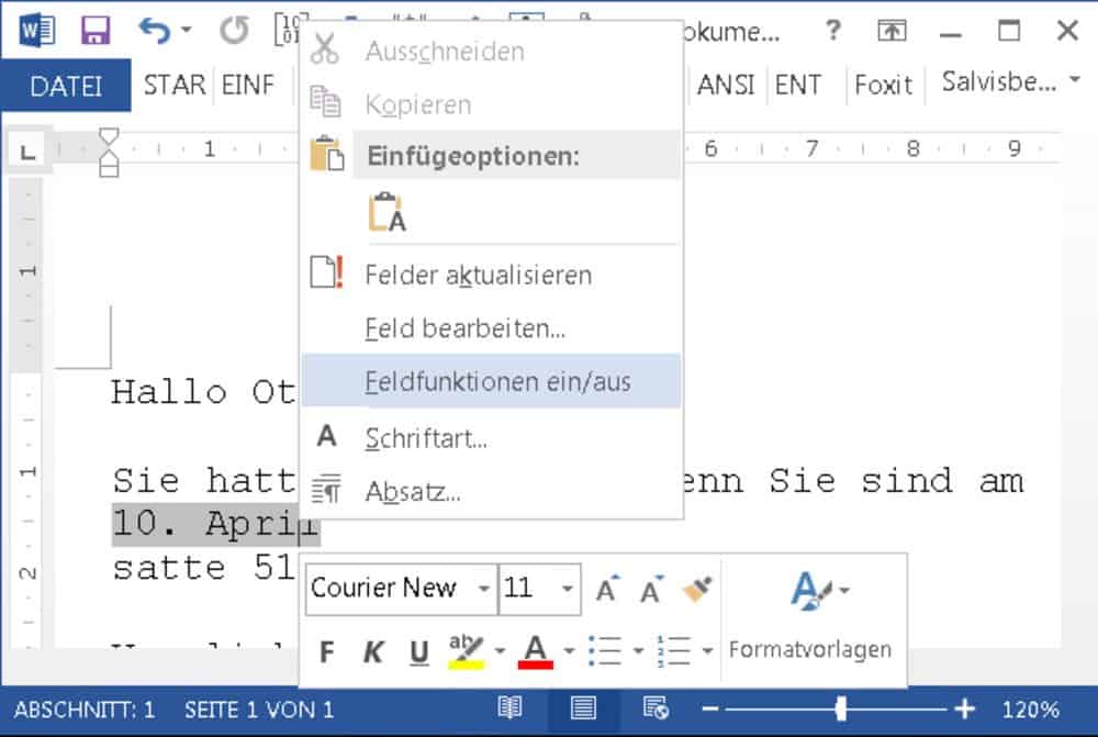 Fügen Sie wie gewohnt Ihre Seriendruckfelder ein, inklusive der Datumsfelder. Anschliessend gehen Sie in Ihrer Briefvorlage zu Ihrem «Datum»- oder «Altersangabe»-Feld und klicken Sie mit rechts drauf. Wählen Sie im Kontextmenü den Befehl Feldfunktionen ein.